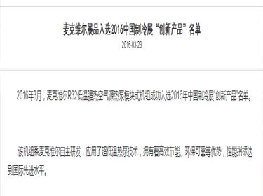 麥克維爾展品入選2016中國制冷展“創新產品”名單